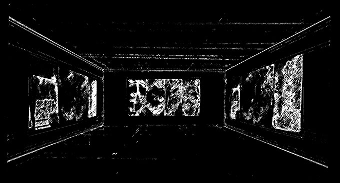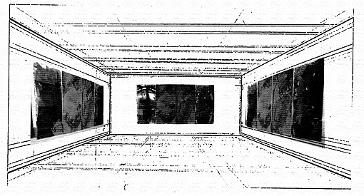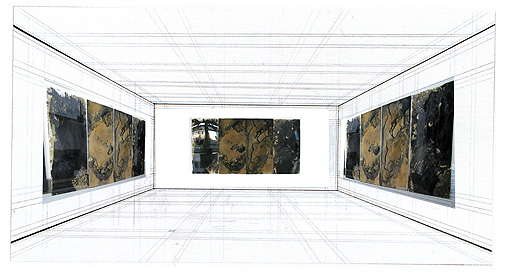 Transparent Perspex sheets, so called “Tectonic Plates”, covered with textured “desert” imagery (made from the mixture of sand and paint) on one side and smooth on their reverse will be attached to the walls. The walls, floor and ceiling are painted black and the spotlights will be directed only onto the ‘plates’. While some panels will show their textured, light absorbing front side, the others will show their highly reflective reverse side incorporating a chance reflection generated in the space.