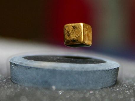 A cubical magnet levitating over a superconducting material (this is known as the Meissner effect)